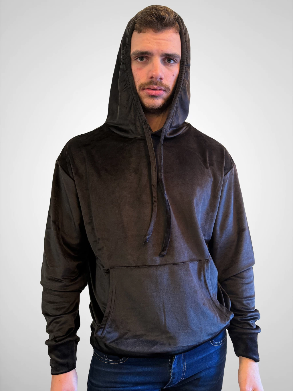 El acabado tipo terciopelo le da un brillo sutil y una textura suave al tacto, mientras que el corte relajado y el bolsillo canguro mantienen la funcionalidad de siempre. Perfecto para usar con jeans o joggers, tanto de día como de noche.